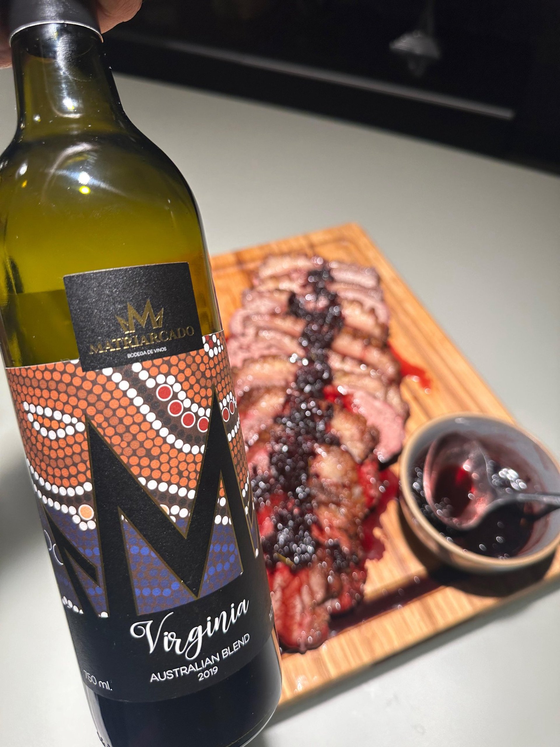 Cortar la punta de solomo en el sentido contrario a las fibras, agregar ligeramente sal marina y la reducción de vino tinto. Servir.